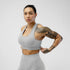 Der Heritage Bra besteht aus einem weichen 4-Wege-Stretchmaterial für Elastizität und Formbeständigkeit, mit strukturierten Seitendetails und einer rückseitigen Schlüsselloch-Designkomponente. Das subtile Gymreapers-Branding ist der Einfachheit halber in den Bund gestrickt.